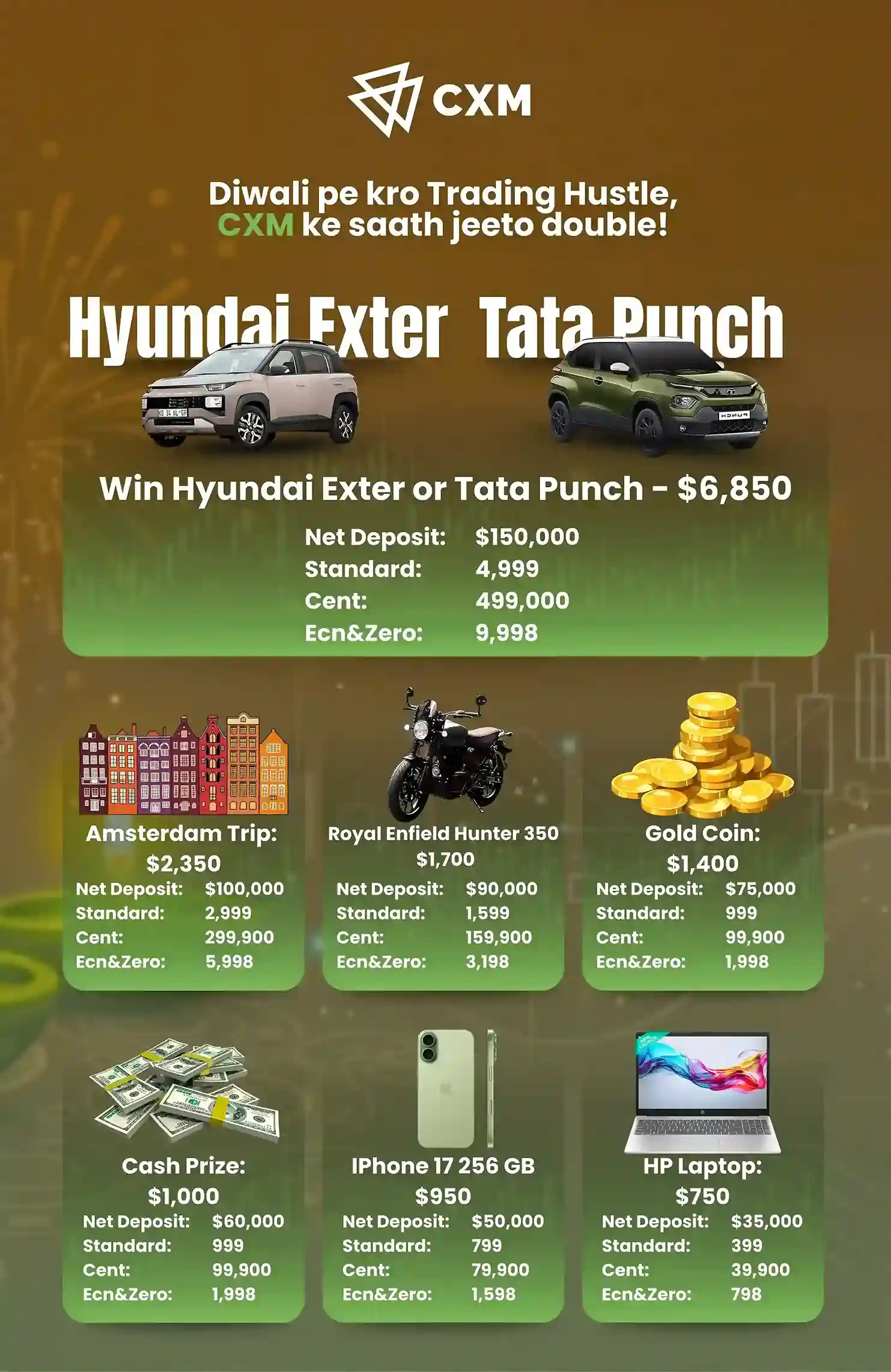 - Hyundai Exter or Tata Punch - $6,850 - Grand Prize - 150k Net Deposit & 4,999 lots