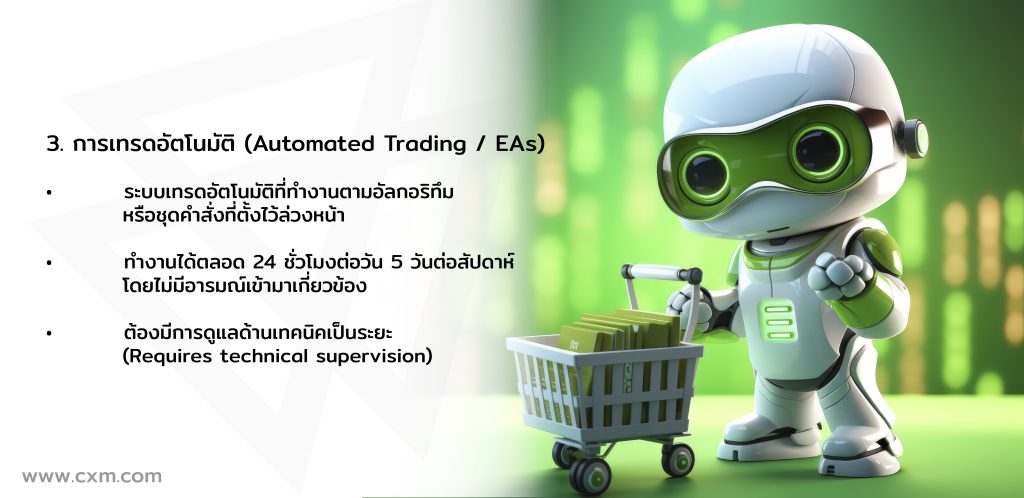 1. การเทรดอัตโนมัติ (EAs) Expert Advisors (EAs) จะรันกลยุทธ์แบบอัลกอริทึมตลอด 24 ชั่วโมง ใน 5 วันทำการ โดยปราศจากอารมณ์มนุษย์ เหมาะสำหรับจับโอกาสการเทรดภายในวันหรือแบบความถี่สูง แต่อย่างไรก็ตาม คุณต้องคอยตรวจสอบด้านเทคนิคและทดสอบความเสถียรก่อนนำไปเทรดด้วยเงินจริง